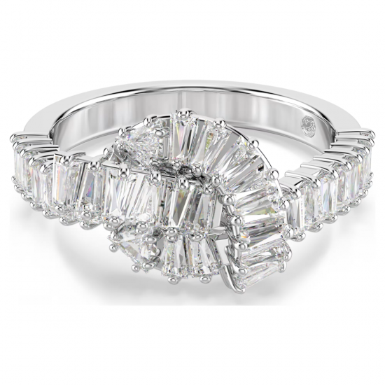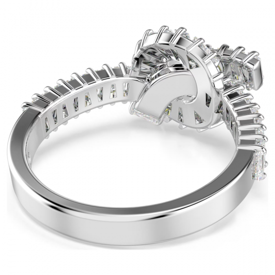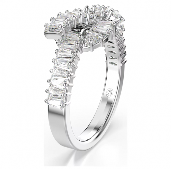 スワロフスキー『Matrix リングです。 リボン結びのようなデザインのロジウム・コーティングのメタルに、バゲットカットのSwarovskiジルコニアをプロング・セッティングで精巧にあしらいました。モダンでアーティスティックなリングは、同じシリーズの他のジュエリーとの相性も抜群です。