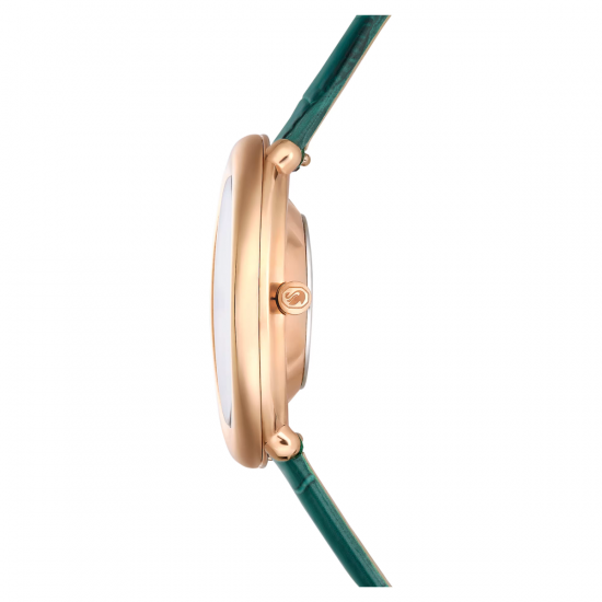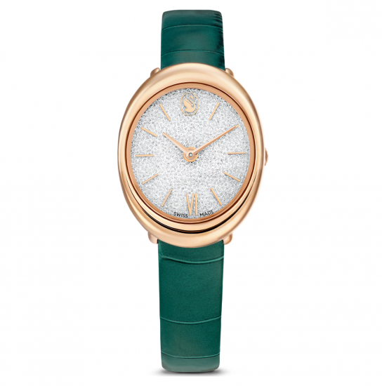 スワロフスキー『Imber oval グリーンウォッチです。 繊細なインデックスに、6時の位置にはローマ数字、12時の位置のSwarovskiのアイコニックなスワンロゴなど、細部までゴールドトーン仕上げが施されています。このSwiss Madeウォッチにはクロコ型押しのグリーンのレザーストラップが付いており、50mの耐水性を備えています。日中からイブニングシーンまで幅広く活躍する洗練されたスタイルです。